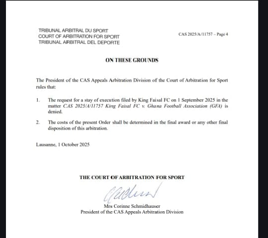 “The request for a stay of execution filed by King Faisal FC on 1 September 2025 in the matter CAS 2025/A/11757 King Faisal FC v. Ghana Football Association (GFA) is denied,” the order read. It added that costs arising from the application would be settled in the final award.