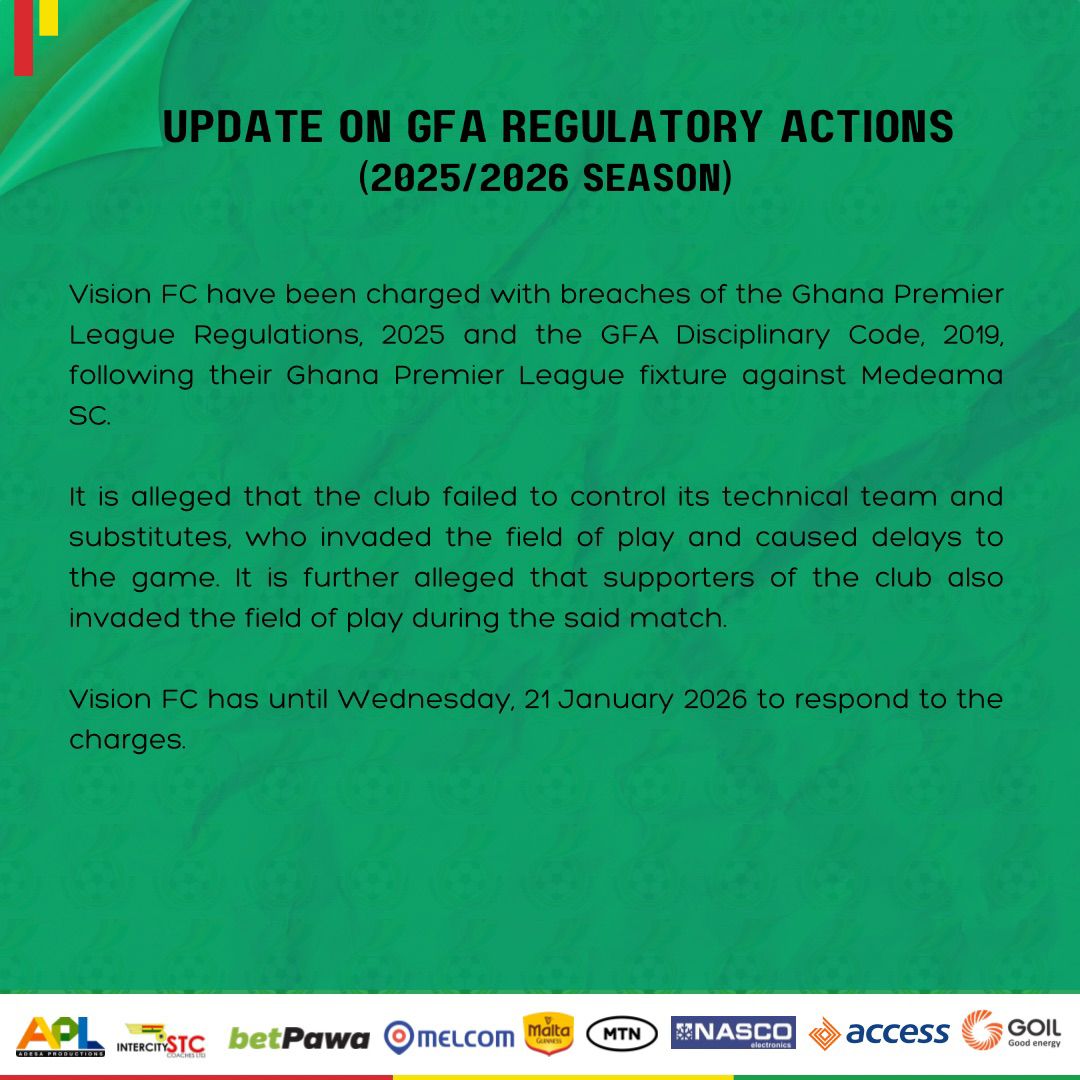 Vision FC have been officially charged for breaching the Ghana Premier League Regulations, 2025 and the GFA Disciplinary Code, 2019, after their Matchweek 19 game against Medeama SC over the weekend at the Nii Adjei Kraku II Sports Complex in Tema Newtown.